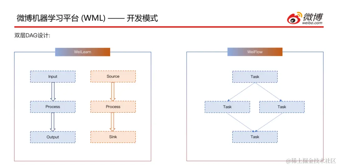 - 内层,WeiLearn 层里面可以重写离线的 Input、Process 和 Output 方法以及实时的 Source、Process 和 Sink 方法,用户自己开发一个 UDF 来实现自己的业务逻辑;内层的每一个 DAG 都会组成一个 Task。