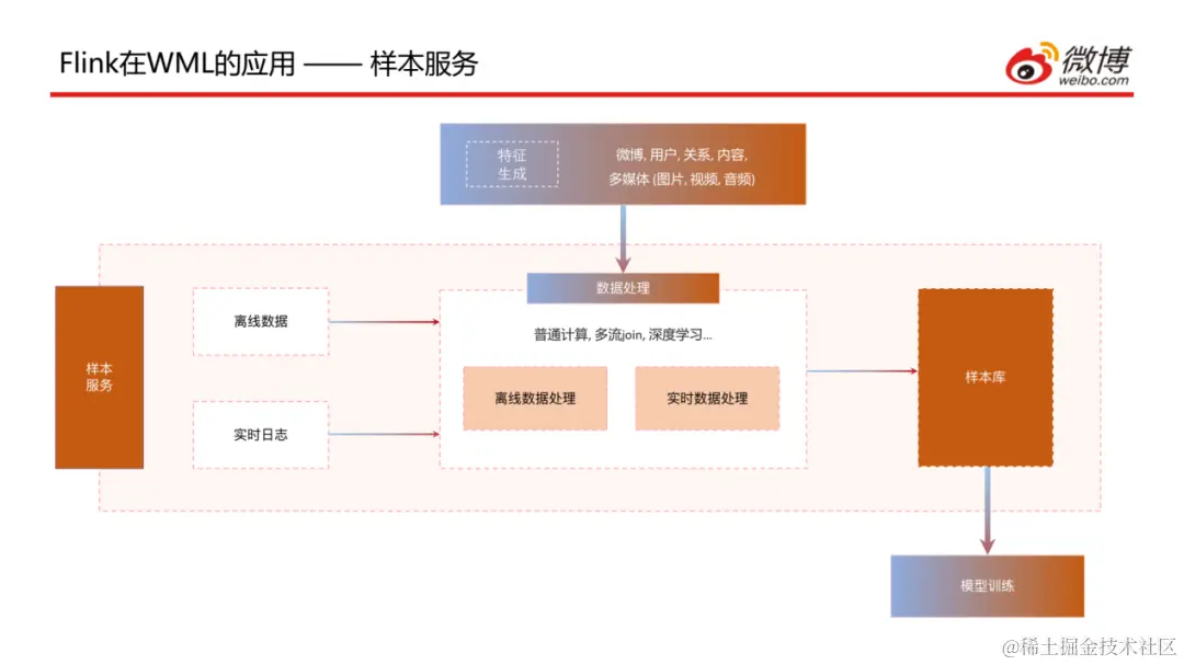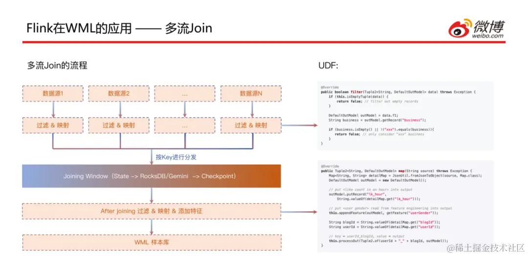 这是微博目前的一个主流场景,多数据流 Join 场景 ( 大部分是大于等于 3 ):有 N 个数据源,通过过滤和映射的处理后按照 Key 进行分发,在 Joining Window 中进行 Join 后 ( 此处后面会详细讲 ),会再进行一次过滤和映射以及添加特征,最后输出到样本库中。