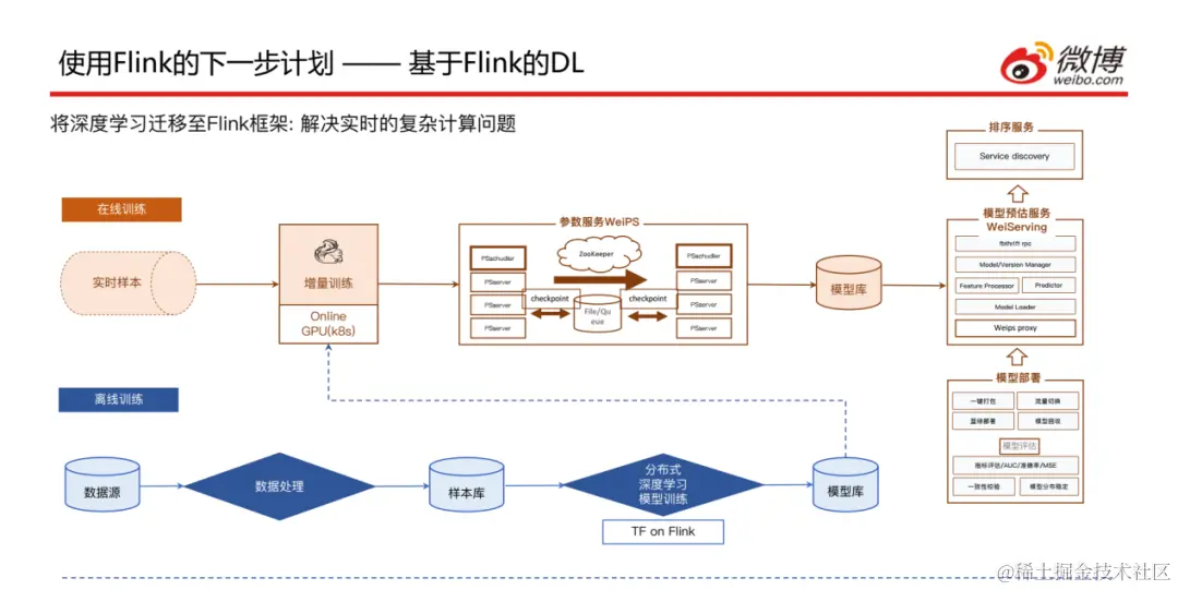 我们希望可以将离线的深度学习完全迁移到在线深度学习来做,这样的话就需要用到 TensorFlow on Flink,这样就可以保证不管是模型训练还是在线推理都可以使用同样一套框架去完成,这样就需要把离线训练的全量模型也可以通过实时样本进行增量训练的一些校正,后面的步骤和之前基本上是保持一致的,这样就可以将离线深度学习的这条 Pipeline 优化一些。