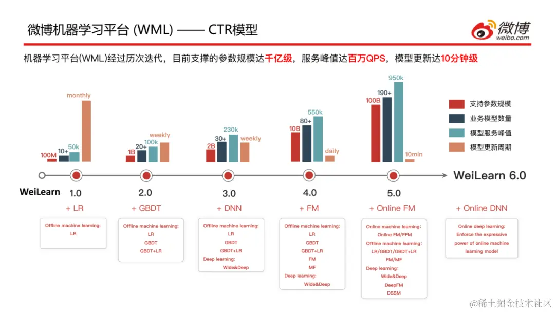 介绍一下 CTR 模型在微博迭代的情况,经过几年的研究和探索,目前支撑的参数规模达千亿级,服务峰值达百万 QPS,模型更新的周期大概在 10 分钟左右;现在是 Weilearn6.0 版本,可以看到 WeiLearn 在不断完善更新自己的算法: