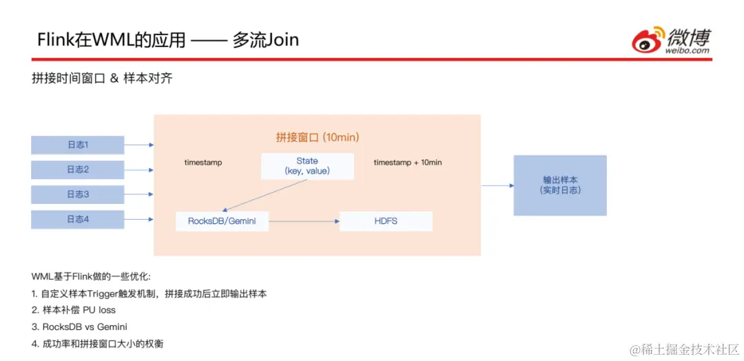 接下来看一下刚刚讲到的拼接窗口的实现方式,这是和业务比较相关的,对于 CTR 场景来说日志有很多种 ( 多个行为日志 ),但是到达的时间并不完全一致,比如点击这种行为日志可能会比曝光日志到的晚一些;这样就会需要一个时间窗口,以 10 分钟为例,如果某种日志先到了,就会将对应的 Key 和 Value 存储到 State 中,状态存储这块是基于 RocksDB 和 HDFS 做的;经过这个十分钟窗口之后,拼接好的样本数据会输到实时流中;此处基于 Flink 做了一些优化: