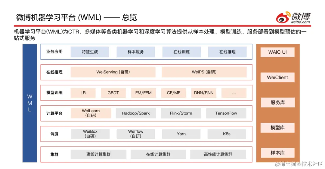 接下来介绍一下微博机器学习平台,即 WML 的总览;机器学习平台 ( WML ) 为 CTR、多媒体等各类机器学习和深度学习算法提供从样本处理、模型训练、服务部署到模型预估的一站式服务。