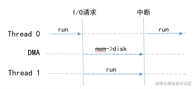 Thread0收到I/O请求,将请求转发给DMA,DMA执行请求