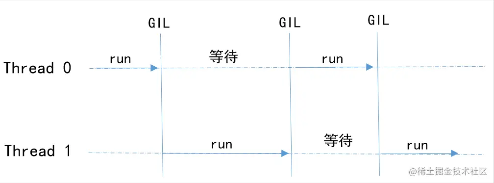 线程Thread0首先执行,线程Thread1等待(GIL的存在)