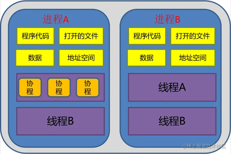 协程(Coroutine,又称微线程)是一种比线程更加轻量级的存在,协程不是被操作系统内核所管理,而完全是由程序所控制。协程与线程以及进程的关系见下图所示。