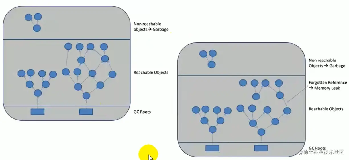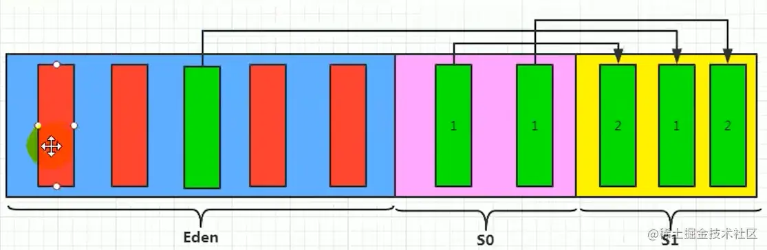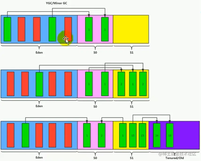 如图所示,达到回收内存临界点,进行垃圾回收操作