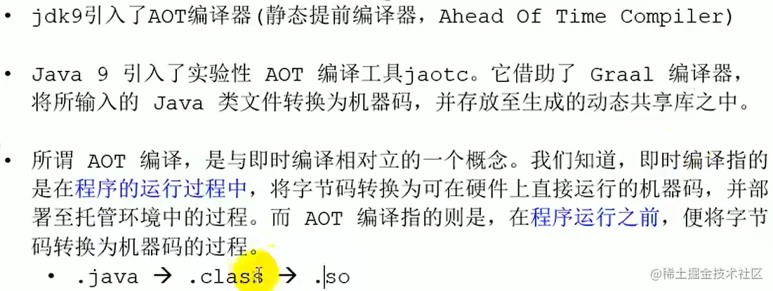 目前也有从源代码直接到机器码的AOT编译器(提前编译器),个人理解为一步完成了javac和JIT的功能,.class到.so文件使用jaotc工具