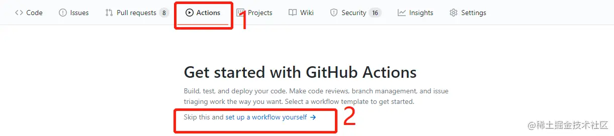 进入项目,点击 Actions选项,然后 点击set up a workflow yourself ,然后会生成一个.github/workflows/main.yml文件。然后按照要求开始编辑main.yml文件(该文件是可以自定义名称的)。