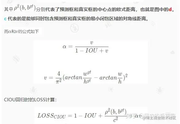IoU经过GIOU再到DIOU最终发展到CIOU,CIOU将目标与框框anchor之间的距离,重叠率、尺度以及惩罚项都考虑进去,使得目标框回归变得更加稳定,不会像IoU和GIoU一样出现训练过程中发散等问题,而惩罚因子把预测框长宽比拟合目标框的长宽比考虑进去,在最新发布的yolov4中anchor的回归就是用的CIOU方式。