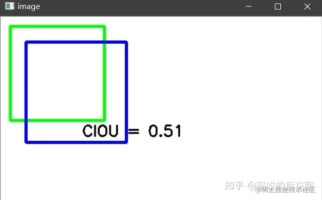 首先借助Opencv和numpy框画两个框,然后按照公式计算CIOU进行展示,如下图。
