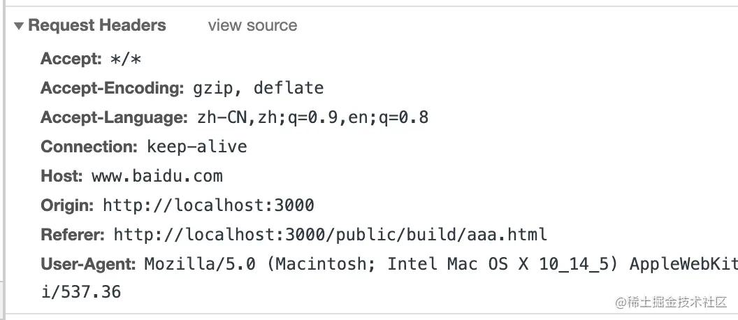 下图为非同源访问:http://localhost:3000/public/build/aaa.html 访问http://www.baidu.com/,注意观察request的header里面是有Origin字段的Origin: http://localhost:3000。