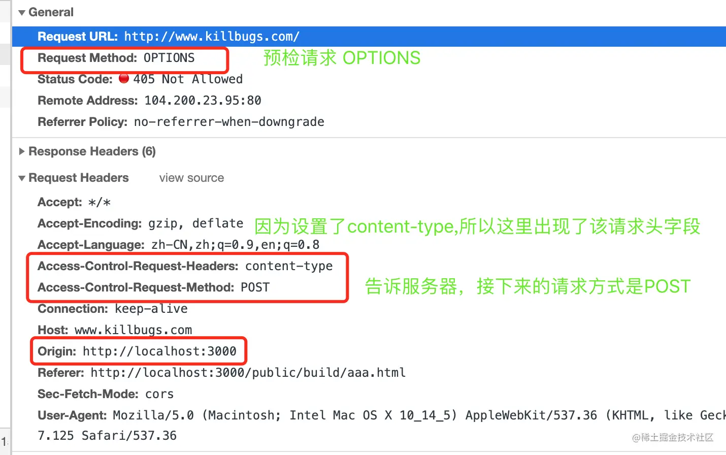 下面代码是http://localhost:3000/public/build/aaa.html对http://www.killbugs.com/的跨域非简单请求,因为设置了content-type:application/json; charset=UTF-8