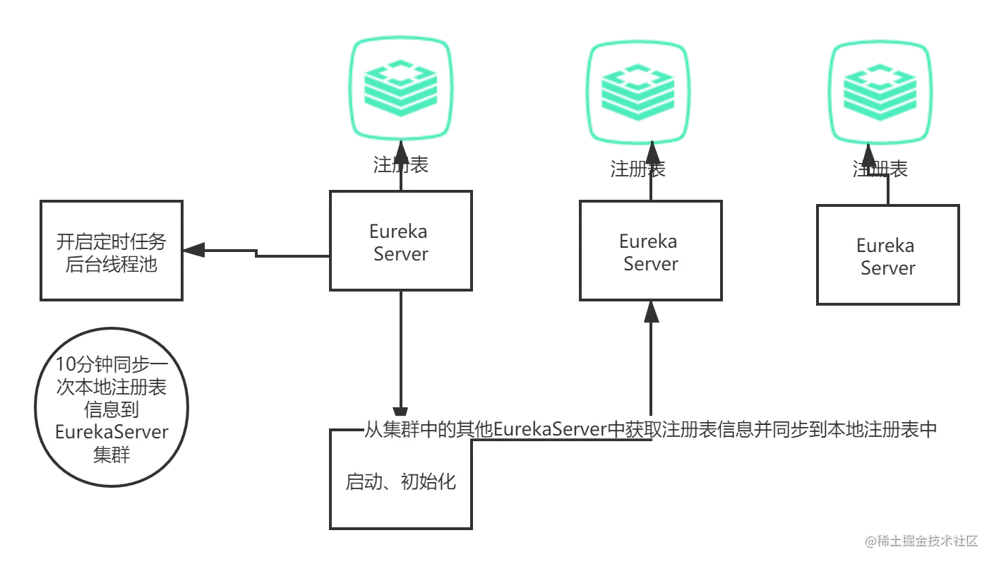 - EurekaServer 在初始启动时会同步集群中其他 EurekaServer 节点的注册表,并保存到本地,同步的方法是