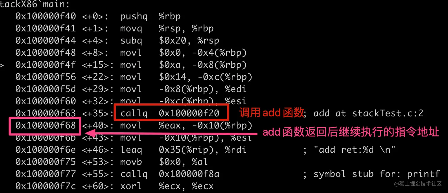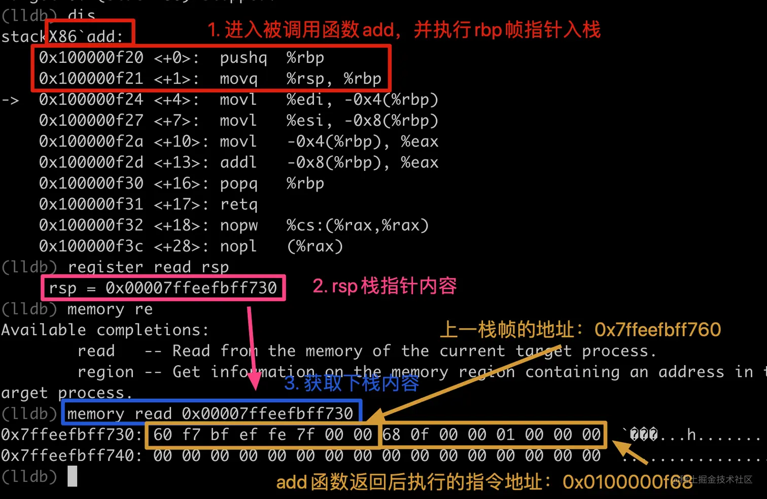上图中的0x100000f68就是调用add函数入栈的函数返回后继续执行的指令地址,调用add函数首先要压入帧指针地址push %rbp,所以,帧指针fp保存的为上一栈帧的地址,fp+1保存的为pc上一函数的指令地址。