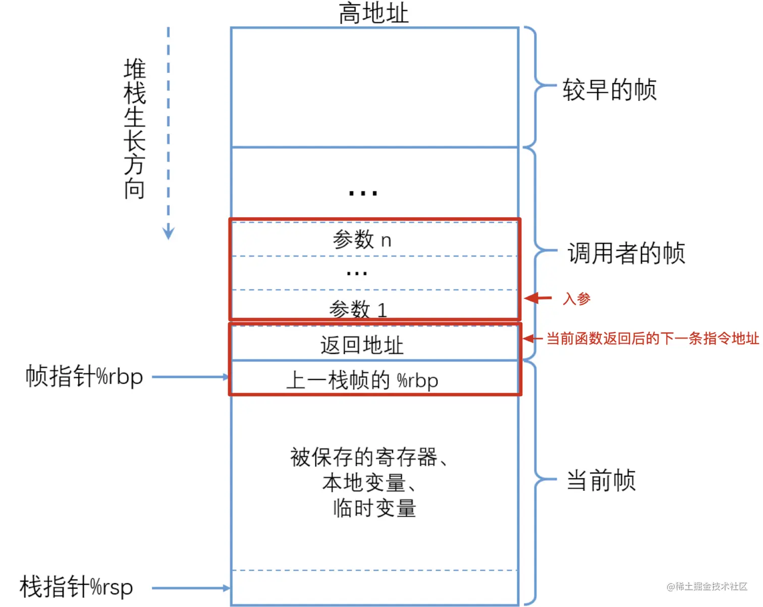 上图可以看出帧指针保存的为“上一栈帧地址+返回地址”,其中返回地址就是调用者执行调用函数后的下一条指令的地址;
