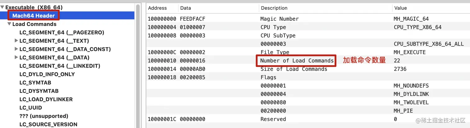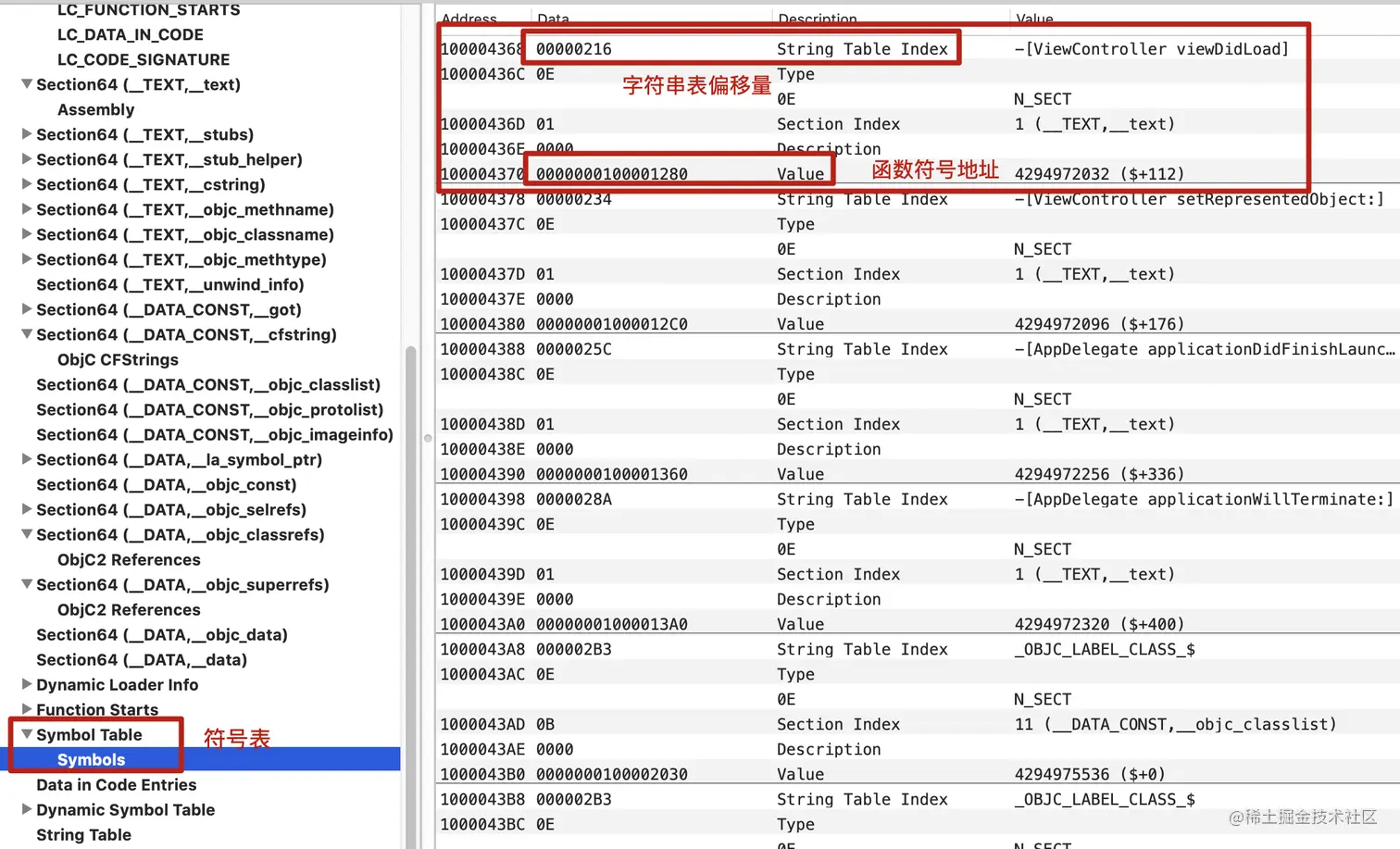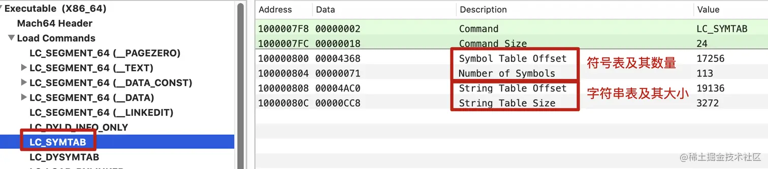 LC_SYMTAB加载命令获取符号表及字符串表的信息,如地址、数量及大小,就可以获取符号表中的所有符号及字符串表中对应的函数名称,具体代码如下://获取Mach-O Header const struct mach_header* header = _dyld_get_image_header(index); //通过header遍历Load Commands获取_LINKEDIT 及 LC_SYMTAB for(uint32_t iCmd = 0; iCmd < header->ncmds; iCmd++) { const struct load_command* loadCmd = (struct load_command*)cmdPtr; if(loadCmd->cmd == LC_SYMTAB){ symtabCmd = loadCmd; } else if(loadCmd->cmd == LC_SEGMENT_64) { const struct segment_command_64* segmentCmd = (struct segment_command_64*)cmdPtr; if(strcmp(segmentCmd->segname, SEG_LINKEDIT) == 0) { linkeditSegment = segmentCmd; } } } //基址 = 偏移量 + _LINKEDIT段虚拟地址 - _LINKEDIT段文件偏移地址 uintptr_t linkeditBase = (uintptr_t)slide + linkeditSegment->vmaddr - linkeditSegment->fileoff; //符号表的地址 = 基址 + 符号表偏移量 const nlist_t *symbolTable = (nlist_t *)(linkeditBase + symtabCmd->symoff); //字符串表的地址 = 基址 + 字符串表偏移量 char *stringTab = (char *)(linkeditBase + symtabCmd->stroff); //符号数量 uint32_t symNum = symtabCmd->nsyms; -