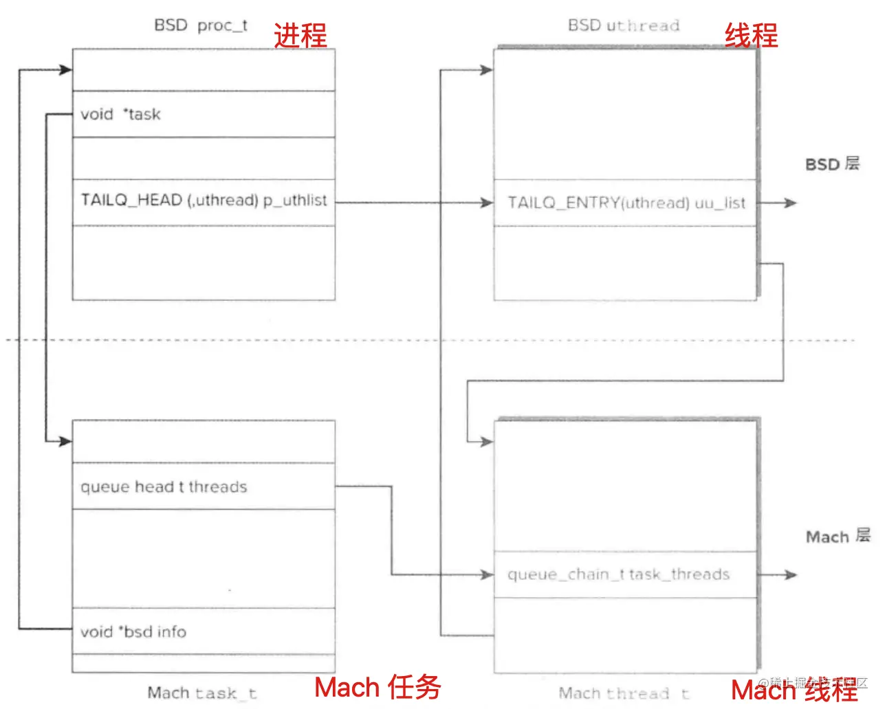 一句话解释:内核中的进程和线程底层实现都是基于Mach任务和线程,其中任务是线程的容器来管理资源,比如文件、I/O设备句柄等,我们熟知的进程和线程都有对应的Mach底层的任务和线程。因此,可以通过底层任务来获取所有包含的线程。