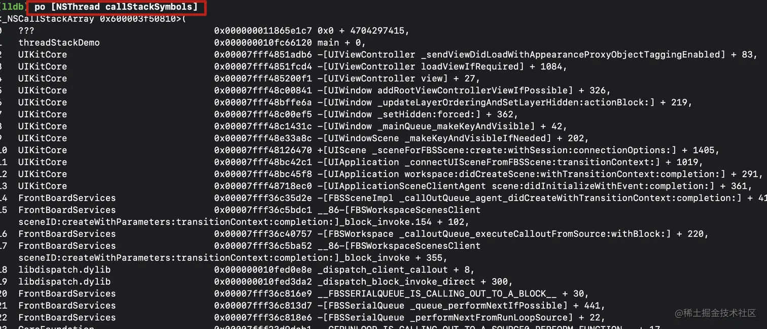 熟悉的是使用[NSThread callstackSymbols]来获取当前函数调用栈,如下图所示: