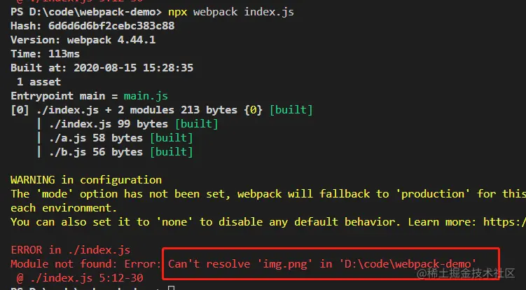 这个时候我们使用npx webpack命令就可以自动打包了,不需要指定后面的文件 因为他会自动查找配置文件里写的入口文件(记得把刚才require的图片删掉,要不会报错 一会处理)