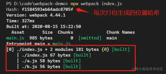 当我们使npx webpack index.js时,表示的是使用webpack处理打包,名为index.js的入口模块。默认放在当前目录下的dist文件夹,打包后的模块名称是main.js,当然我们也可以修改
