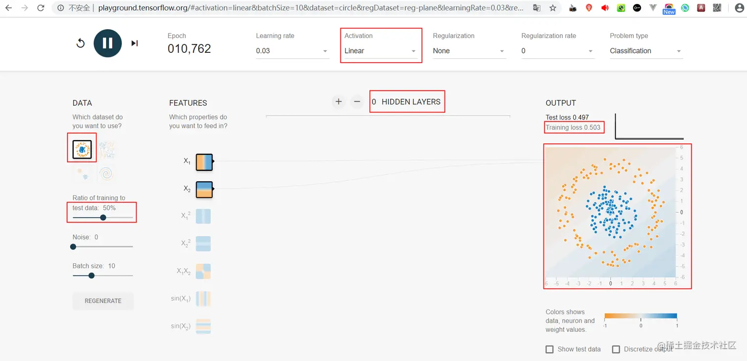 数据很复杂,但是模型很简单,这就是欠拟合。下面我们通过playground.tensorflow.org/来直观感受下欠拟合。
