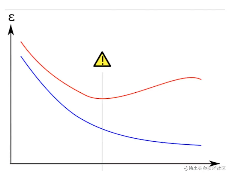 如下图所示是过拟合的损失变化曲线。其中,红色的线代表验证集的损失,验证集的损失在越过某个点之后,变得越来越高了;蓝色的线代表训练集的损失,训练集的损失是越来越小的。导致这种情况的原因是,训练集数据太过简单,而模型却太过复杂。有可能是因为训练集的数据过少。
