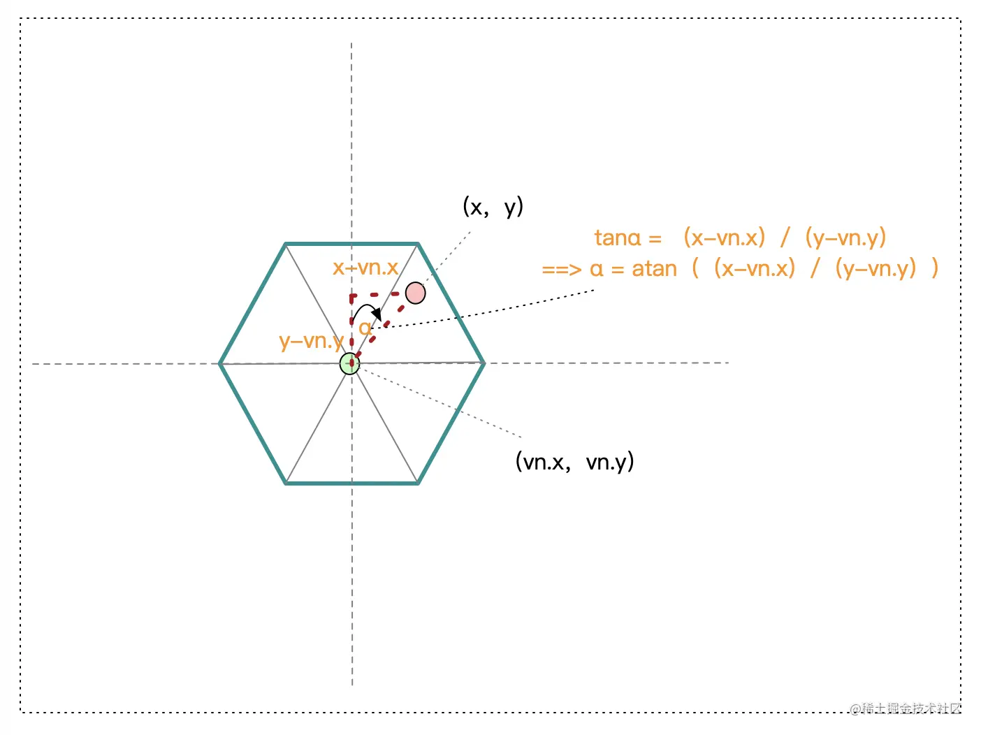 - 求出当前像素点与纹理中心点的夹角,如当前像素点(x,y)与中心点(vn.x, vn.y)