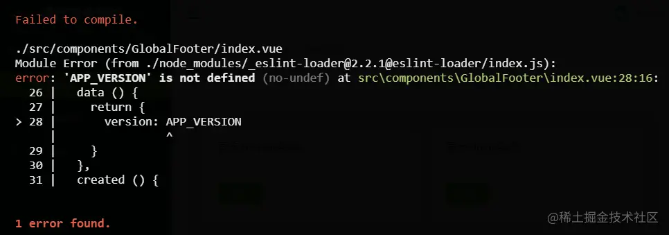 另一种解决方式:在全局变量APP_VERSION的上一行位置添加/* eslint-disable no-undef */,
