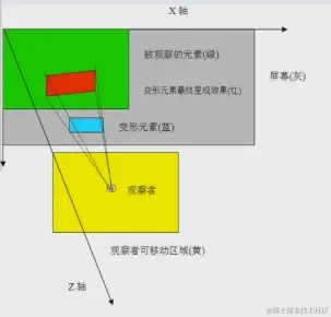 有两种设置方式,一种是在父级元素上,transform-style: preserve-3d; perspective:500px,由于观察者只有一个视角,所以观察同一场景下的不同物体有不同的视角,哪怕都设置了一样的角度【看的是场景,场景变了,里面所有的子集元素都变了】