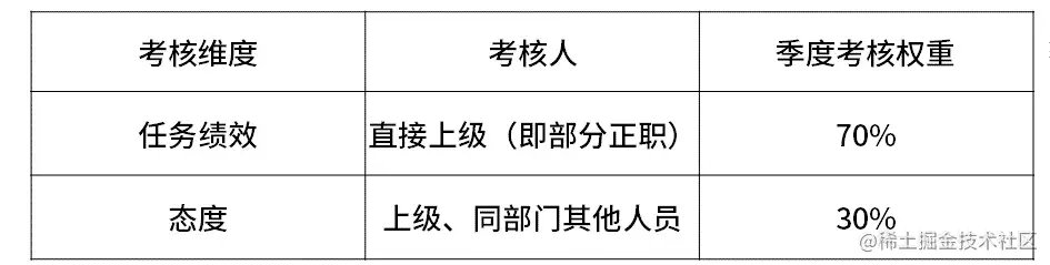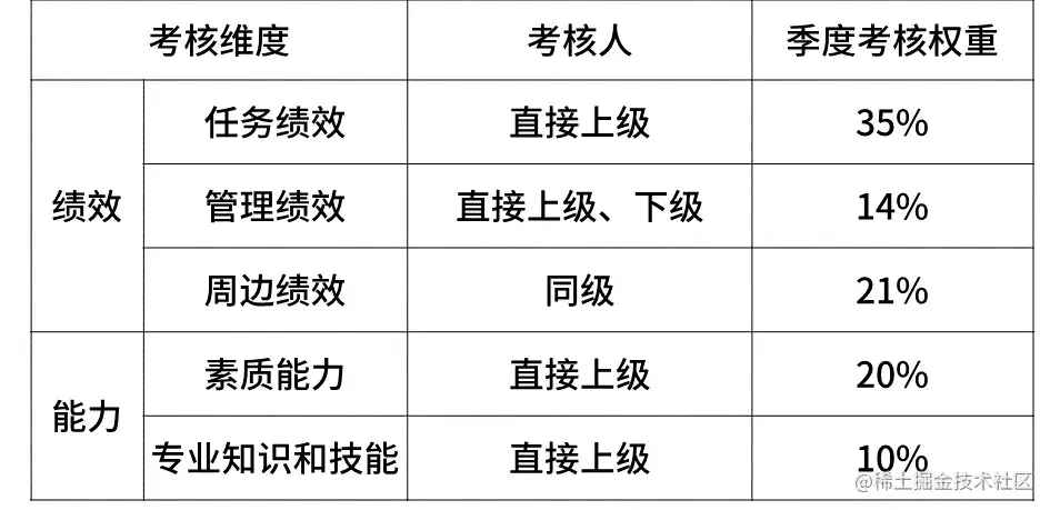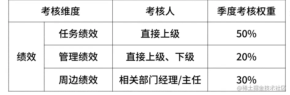 1、季度考核:中层和一般员工都要通过季度考核,根据不同的对象,考核维度与权重也不同。