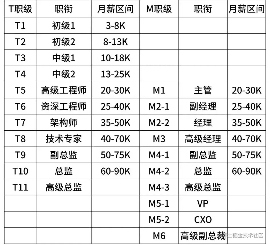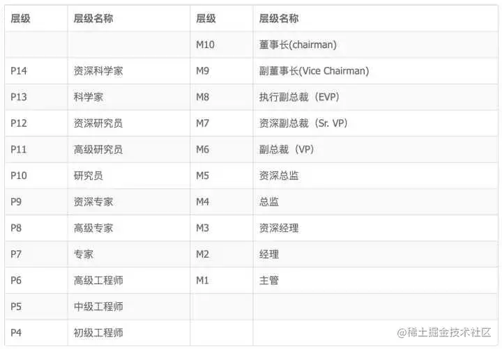 - 一套体系是M路线,即管理者路线【M序列=管理岗】,从M1到M10。