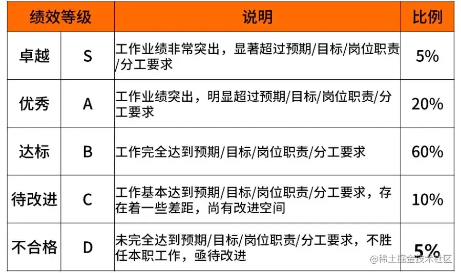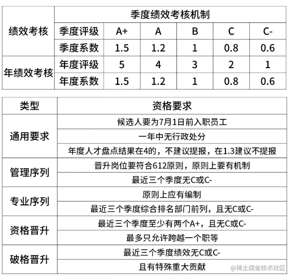 - 自己提名:当你自己觉得已经具备下一level的素质,可以自己提名,提名后进入考察期,主管设定考察期目标,考察通过顺利晋升,考察不通过维持原层级不变;