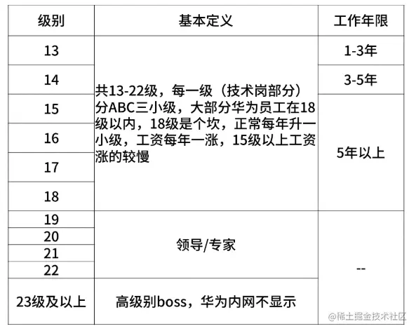 华为员工级别分为13-22级,23级及以上为高级别boss,华为内网并不显示他们的级别。每一级分A/B/C三小级(技术岗不分小级