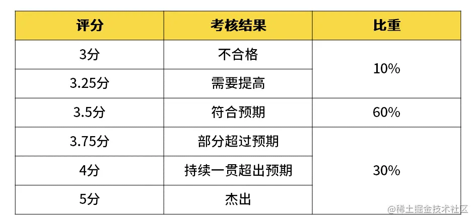 - 绩效评分标准:腾讯的绩效评估分为5档——从 1 星到 5 星,5 星是最好的,1 星可能会走人了。