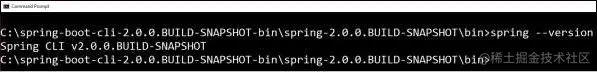 在Windows系统,在命令窗口切换到Spring Boot CLI bin 目录并运行命令 spring –-version 以确保正确安装了 spring CLI。执行命令后,你可以看到如下所示的 spring CLI 版本信息: