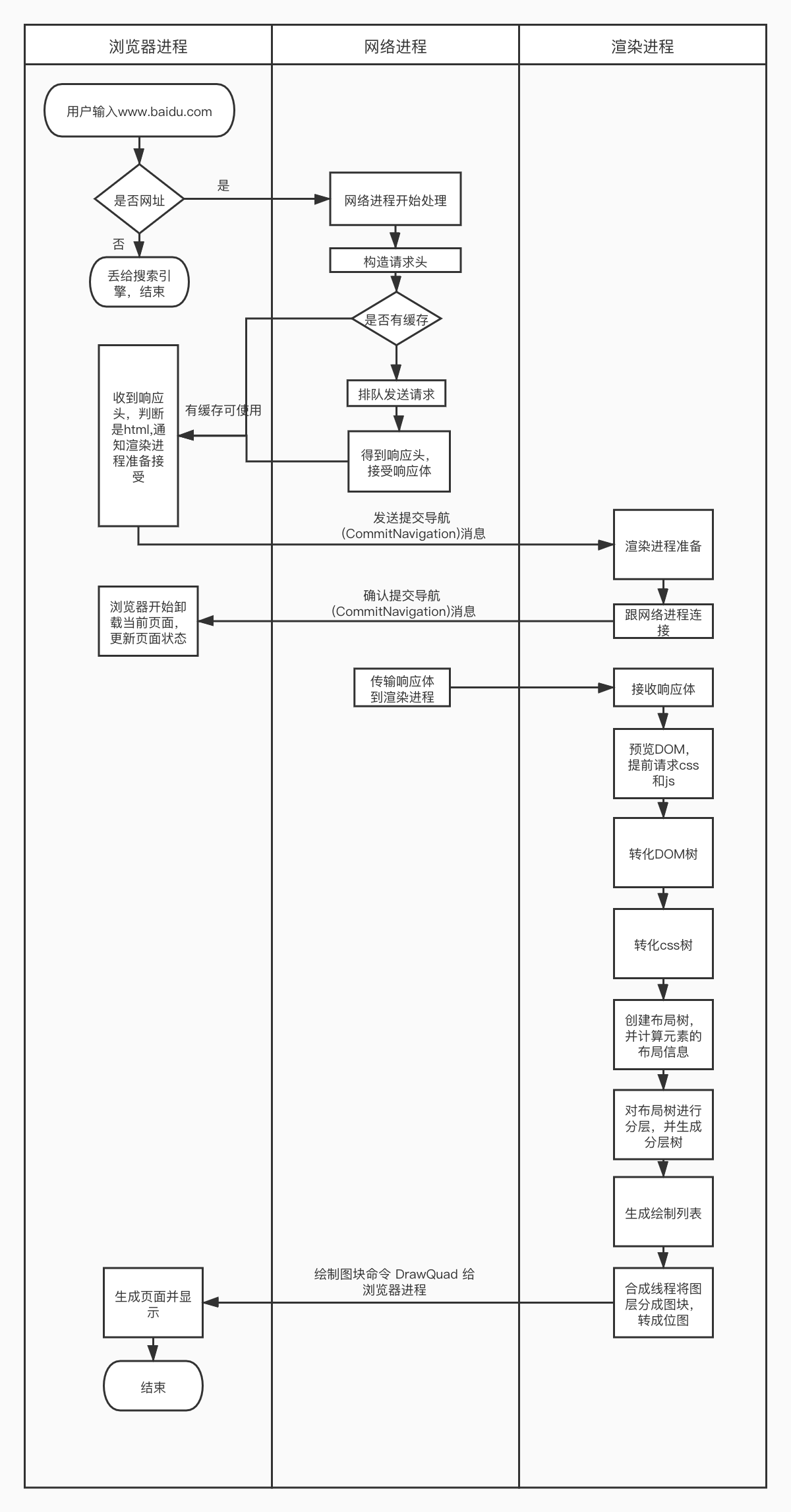 最后渲染进程会向浏览器进程“确认提交”,这是告诉浏览器进程:“已经准备好接受和解析页面数据了”。