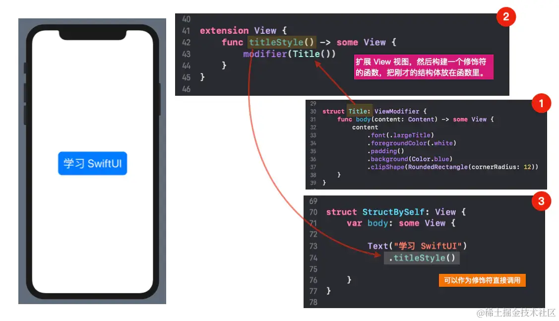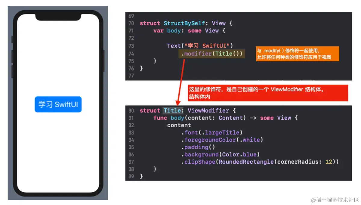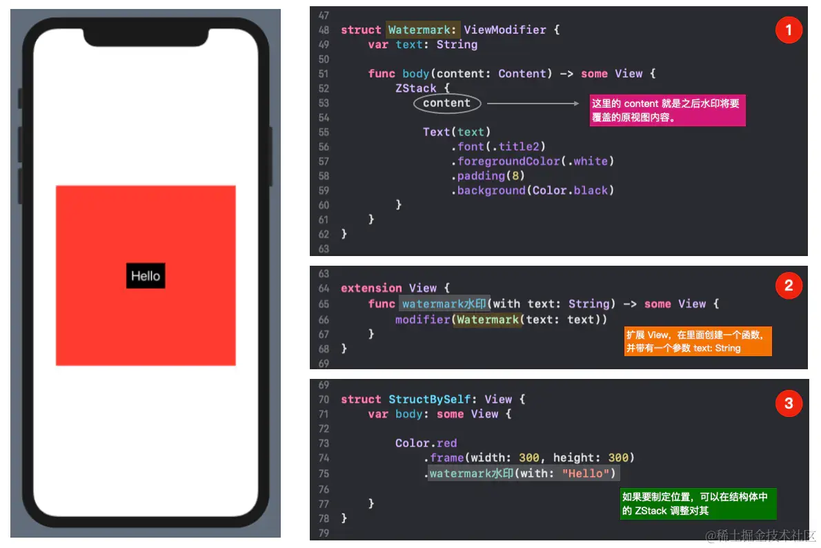 创建自己的修饰符 艾迪不是奥特曼 2020-08-16 161 阅读1分钟 但这样用起来每次都要先使用 .modifier,不是很方便。所以可以把这个结构体扩展到 View 视图中,这样就可以直接使用。 自定义修饰符使用很灵活,可以应用在很多地方。 因为修饰符返回的是一个新的视图对象,而不是修改现有视图对象,因此我们可以创建一个将视图嵌入堆栈并添加另一个视图的对象。 这里用一个自定义的水印修饰符来说明: