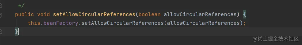 我们看到当前方法是属于AbstractAutowireCapableBeanFactory这个类的,这个类一看就知道是一个BeanFactory对象,其实如果我们可以修改spring源码的话,在容器初始化之前,也就是refresh方法执行之前,我们可以加这样一行代码修改这个值的属性来关闭循环依赖:setAllowCircularReferences(false);