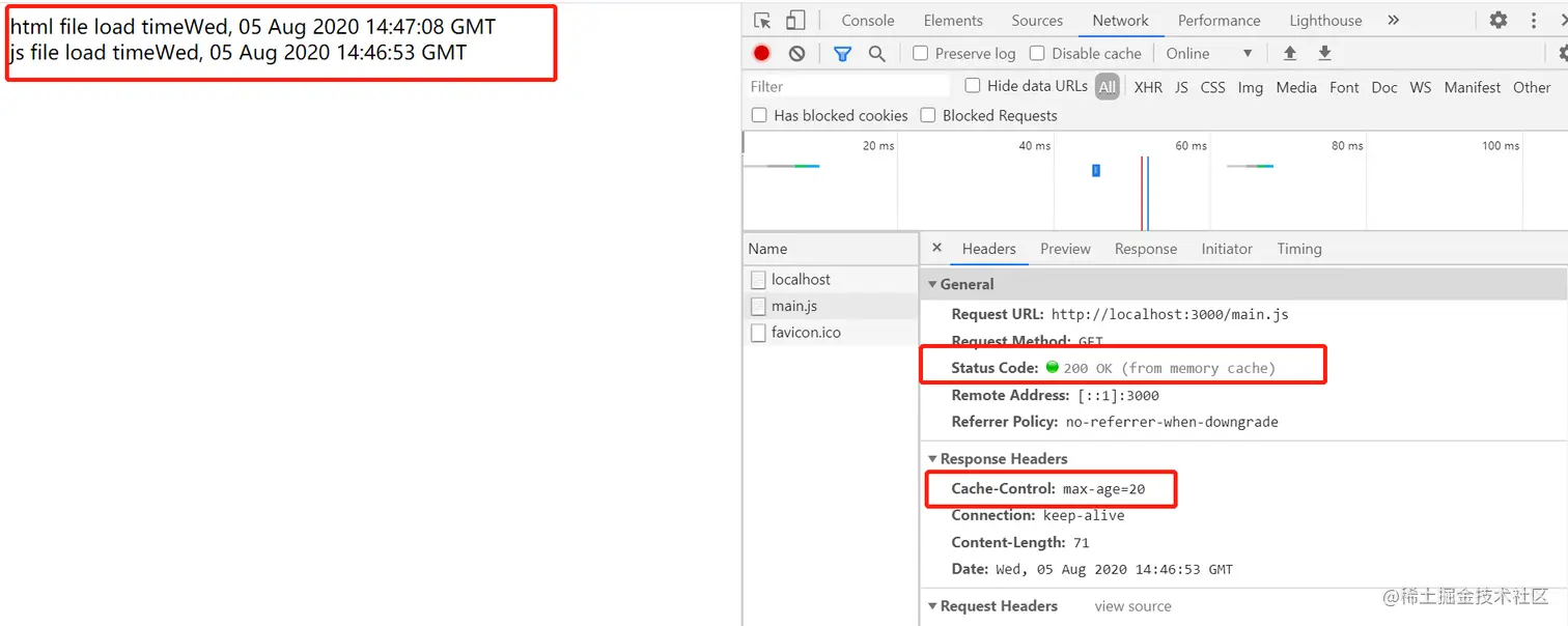 通过在响应头中添加Cache-Control,在过期时间内,获取文件时响应头里的 Status Code都是 200 OK (from memory cache)。添加Cache-Control后的结果如下图所示。