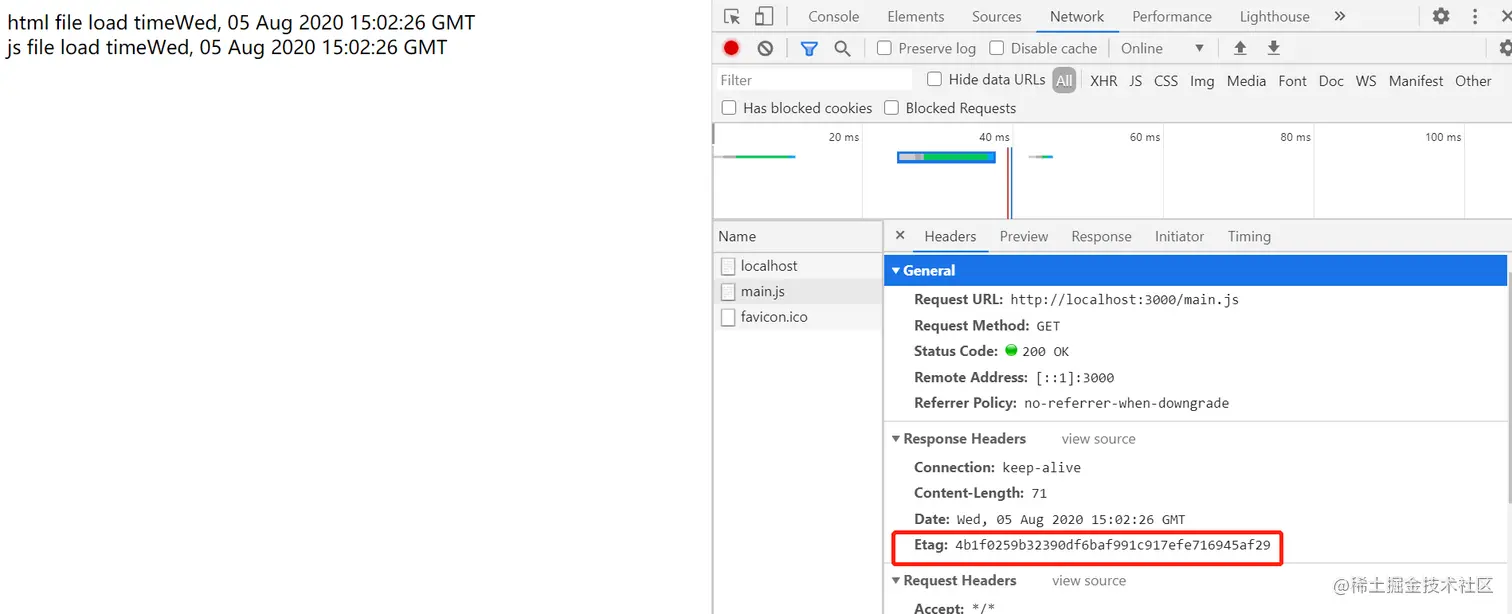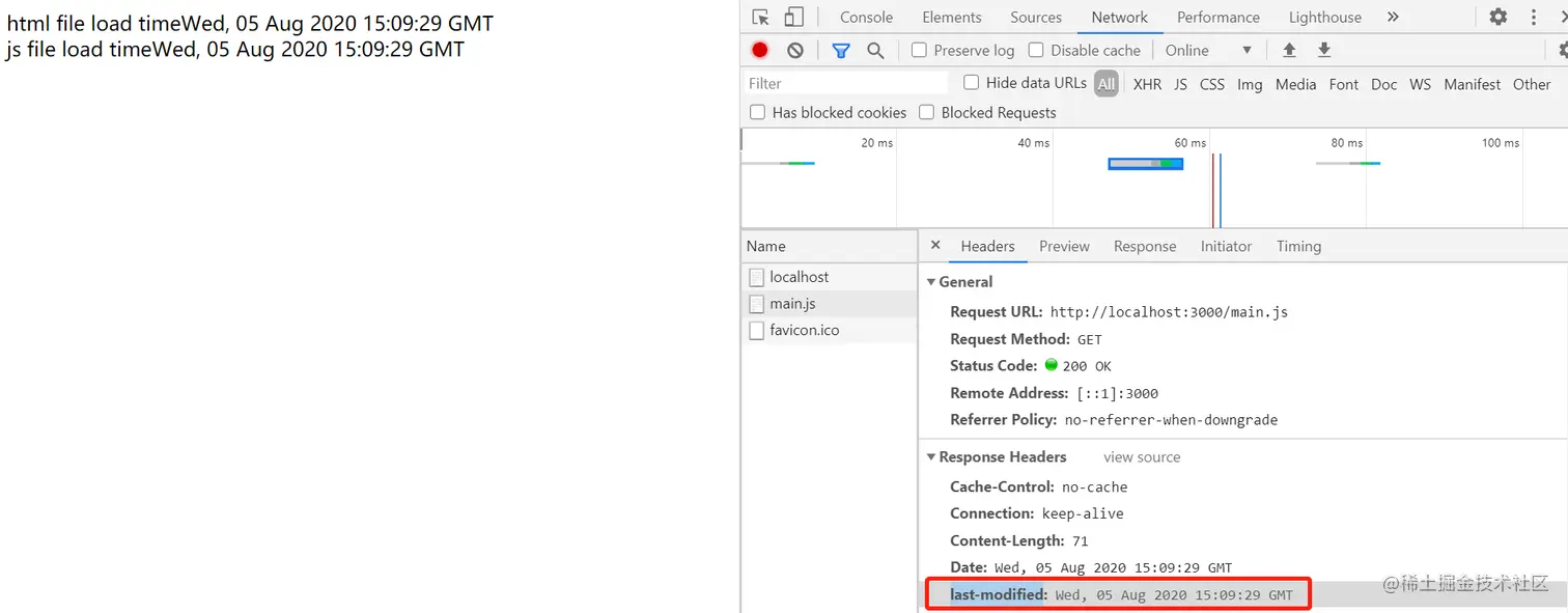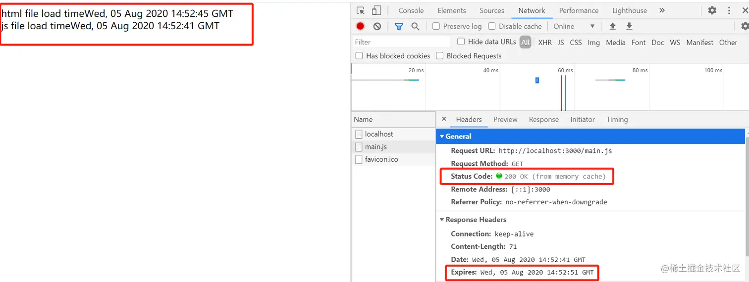 通过res.setHeader(Expires,time) 会在响应头中添加一个 Expires字段,表示过期时间。在过期时间内,获取文件时响应头里的 Status Code都是 200 OK (from memory cache)。添加 Expires响应头的结果如下所示。