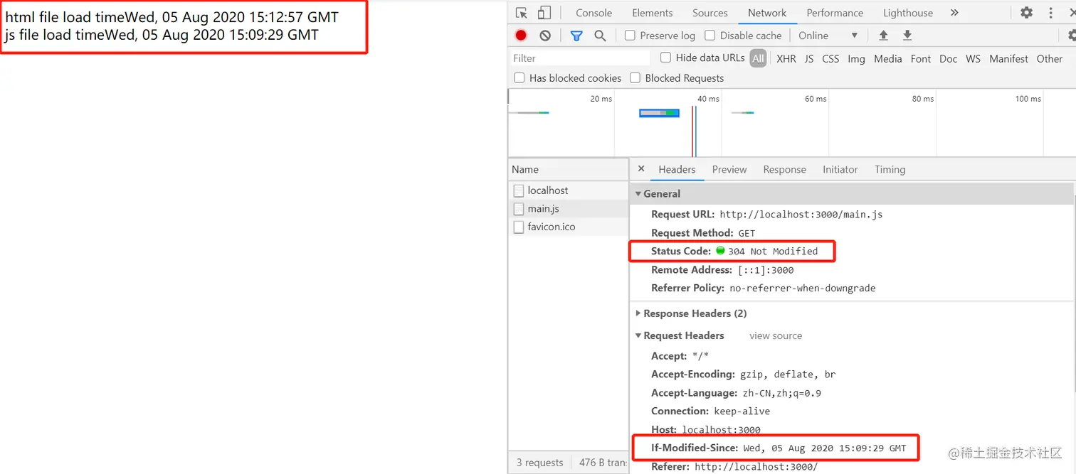 情形一: 若两种判断的结论都是文件没有被修改过,则服务器就不给浏览器发index.html的内容了,直接告诉它,文件没有被修改过,你用你那边的缓存吧—— 304 Not Modified, 此时浏览器就会从本地缓存中获取index.html的内容。