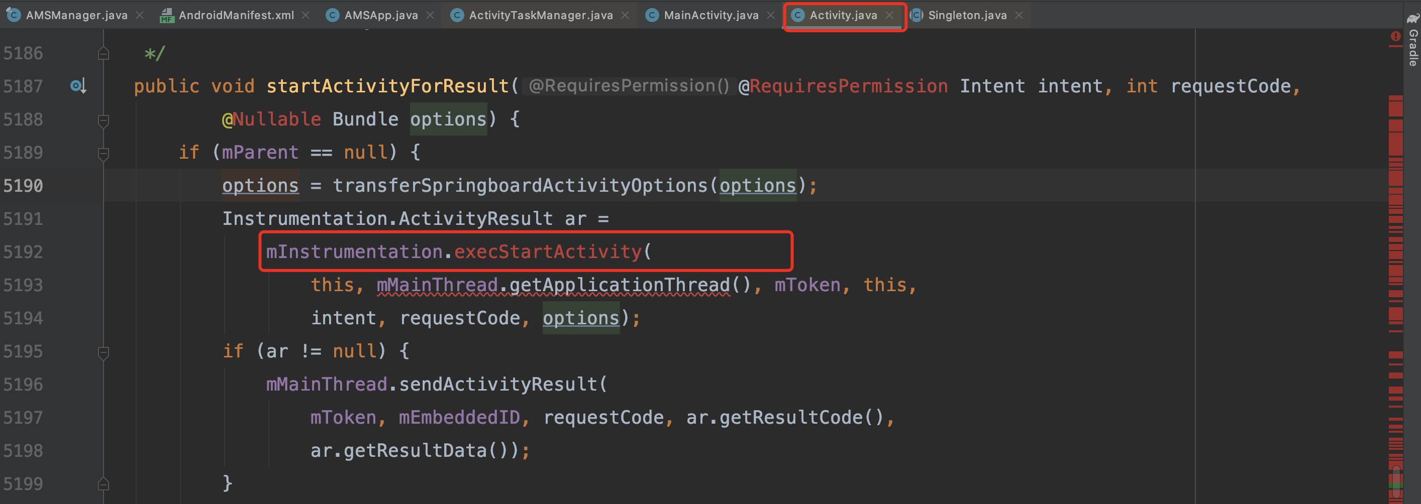在注释1处,android系统通过ActivityManagerNative.getDefault()获取到一个IActivityManager接口,然后调用了这个接口的startActivity()方法。这里的IActivityManager接口实际上就是AMS,activity的检查将会在AMS中进行。