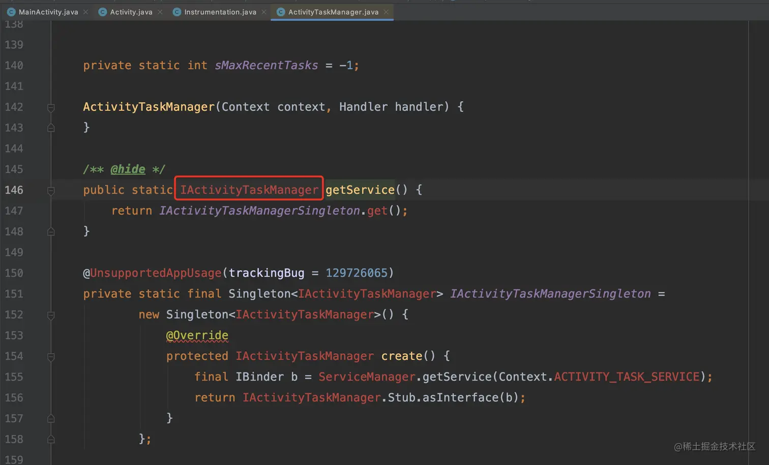但是 IActivityTaskManagerSingleton 这个属性并没有被hide,于是通过IActivityTaskManagerSingleton属性获取 IActivityTaskManager 接口