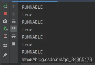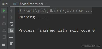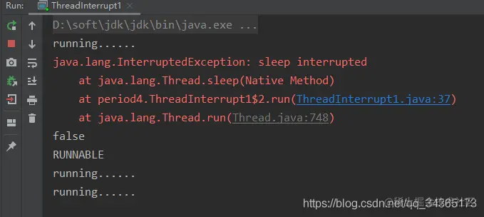 上面代码,线程sleep后处于阻塞状态,这个时候去执行Interrupt,会报java.lang.InterruptedException: sleep interrupted异常,而且线程的状态也变成了runnable,isInterrupted也从true变回false,并且打印running语句会继续执行,说明线程并没有真的被中止。运行结果如下: