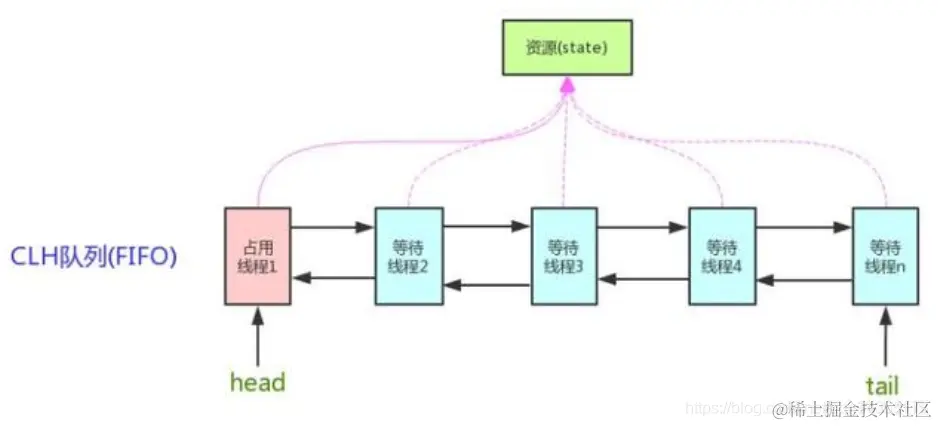 JUC包就是基于AQS实现的,AQS的设计模式就是模板模式,数据结构是双向链表和锁状态(state),底层实现是CAS。它的state不像上面读写锁说的是两个count,它用一个state实现,即我们知道int类型有8个字节,它的实现是前4个字节可以标识读锁,后四个字节可以标识写锁。