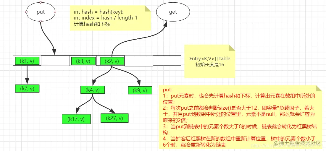 当put的时候需要计算hash和下标,这个时候计算出来的值可能存在一样的,那么存到数组中的相同位置,就会发生hash冲突,