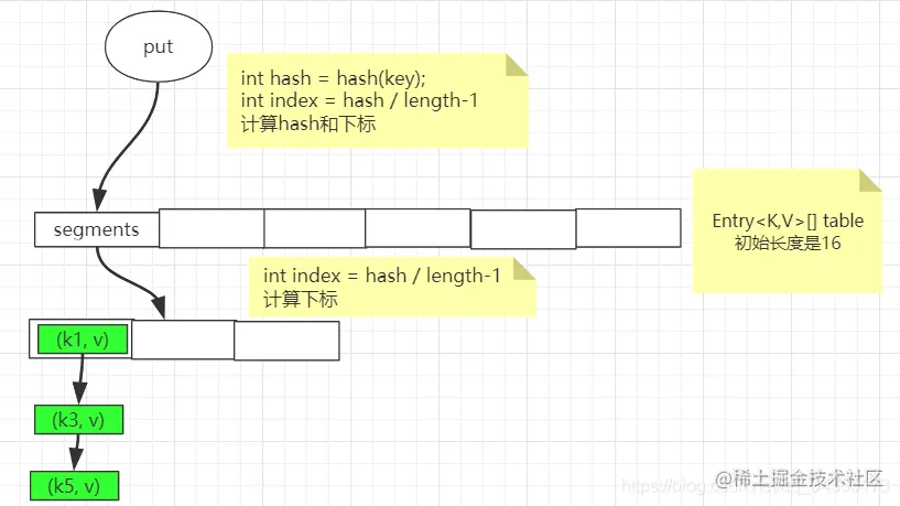 可以看到1.7中的ConcurrentHashMap数组中所存的是segments,每个segments下都是一个hashTable。当put元素时,会加锁,然后计算hash和下标,计算下标会计算两次,一次是在数组中的segments的位置,一次是在hashTable的位置。
