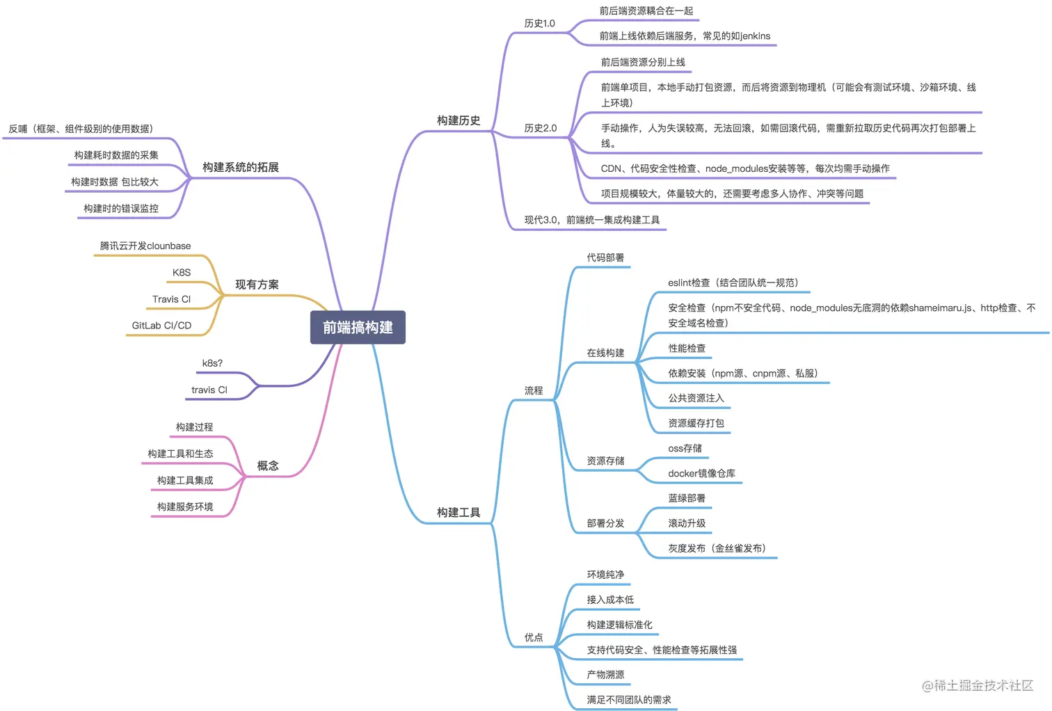 构建包括,构建过程(输入源码到生成代码的过程)、构建工具和生态(webpack、rollup、TS)、构建工具的集成(CLI、create-react-app、Vue CLI)、构建服务环境(jenkins、trvalCI)。本篇文章会围绕构建服务环境来进行展开,下面我画了个思维导图,有足够了解的同学可以直接看图来进行了解,当然如果本篇文章给你带来一些思路和对构建的了解,记得点个小心心再走,笔芯~
