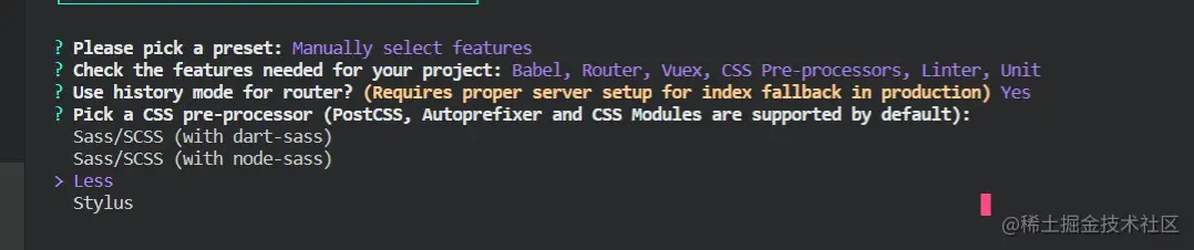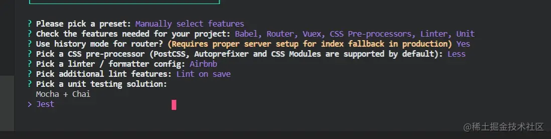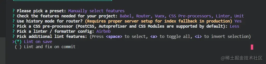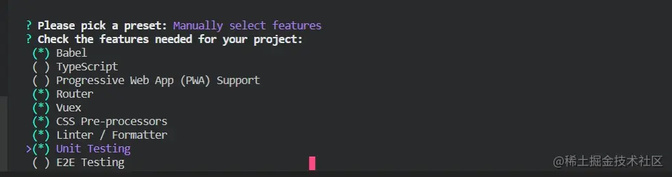 选择项目需要的一些特性(此处我们选择需要 Babel 编译、使用 Vue 路由、Vue 状态管理器、CSS 预处理器、代码检测和格式化、以及单元测试,暂时不考虑端到端测试(E2E Testing)