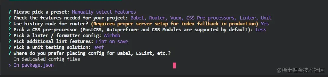 选择 Babel、PostCSS、ESLint 等配置文件存放位置,此处选择保存在 json 文件中